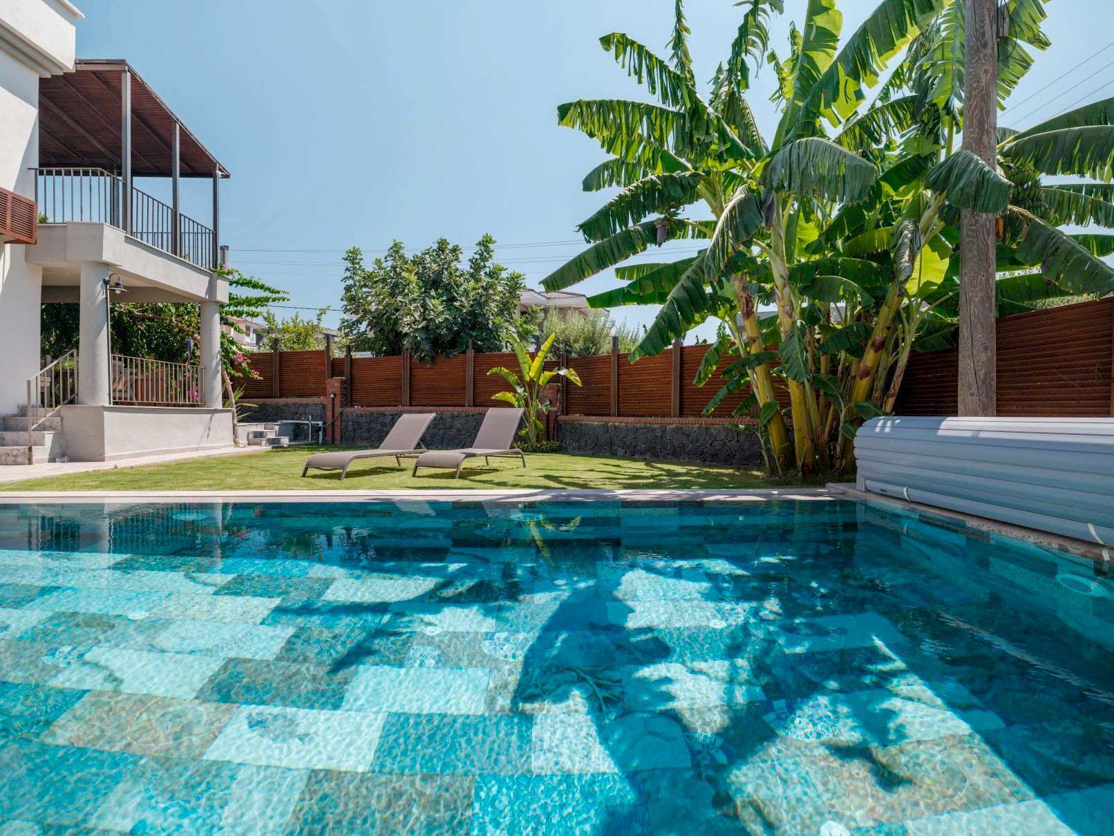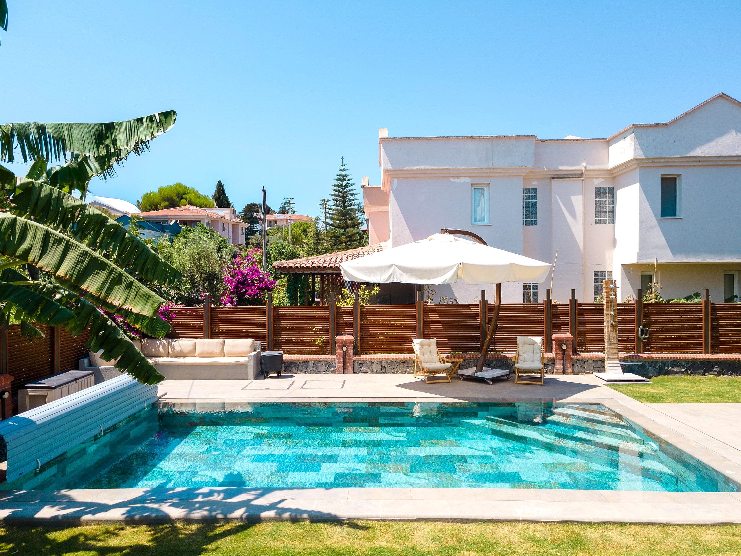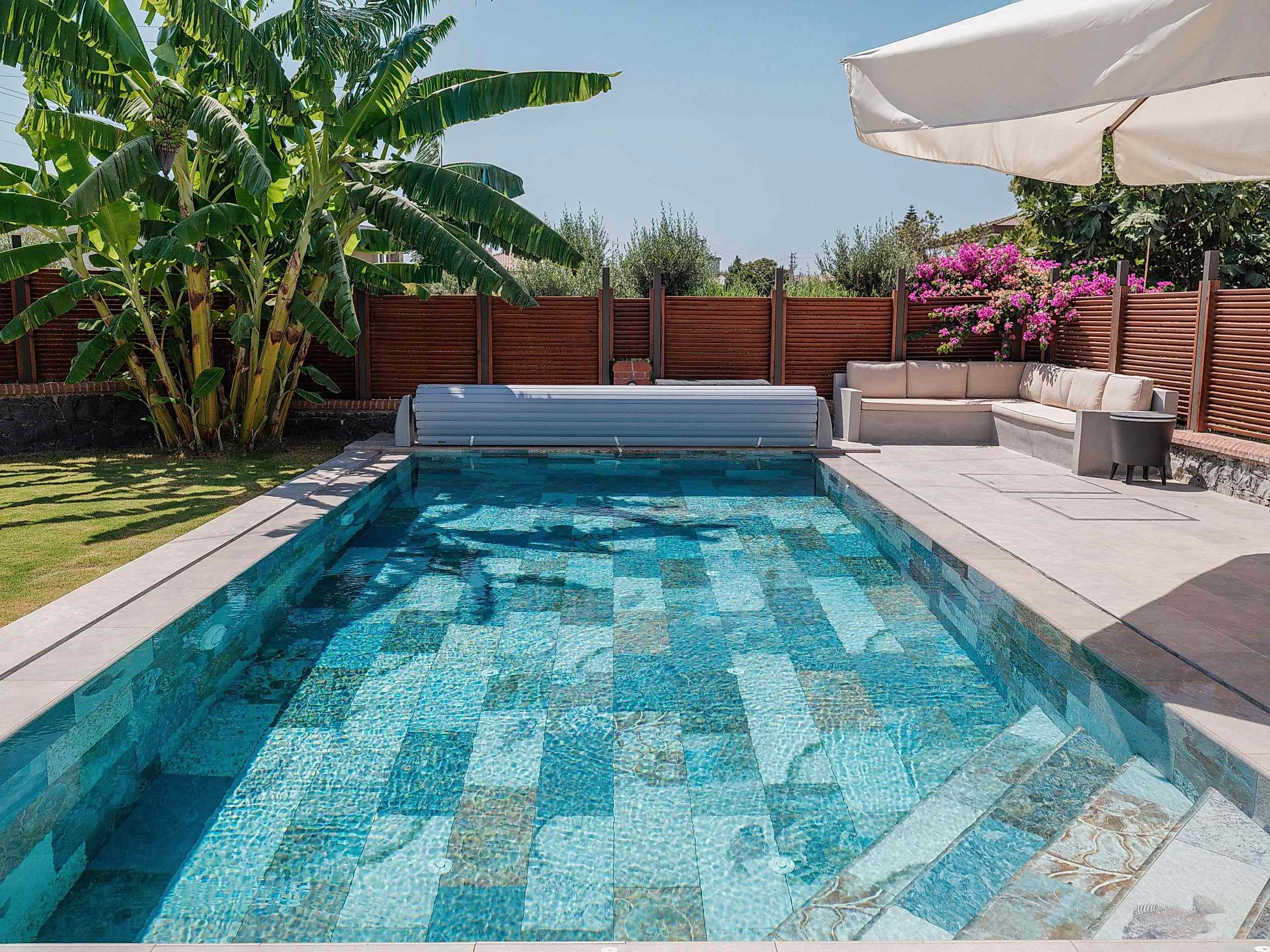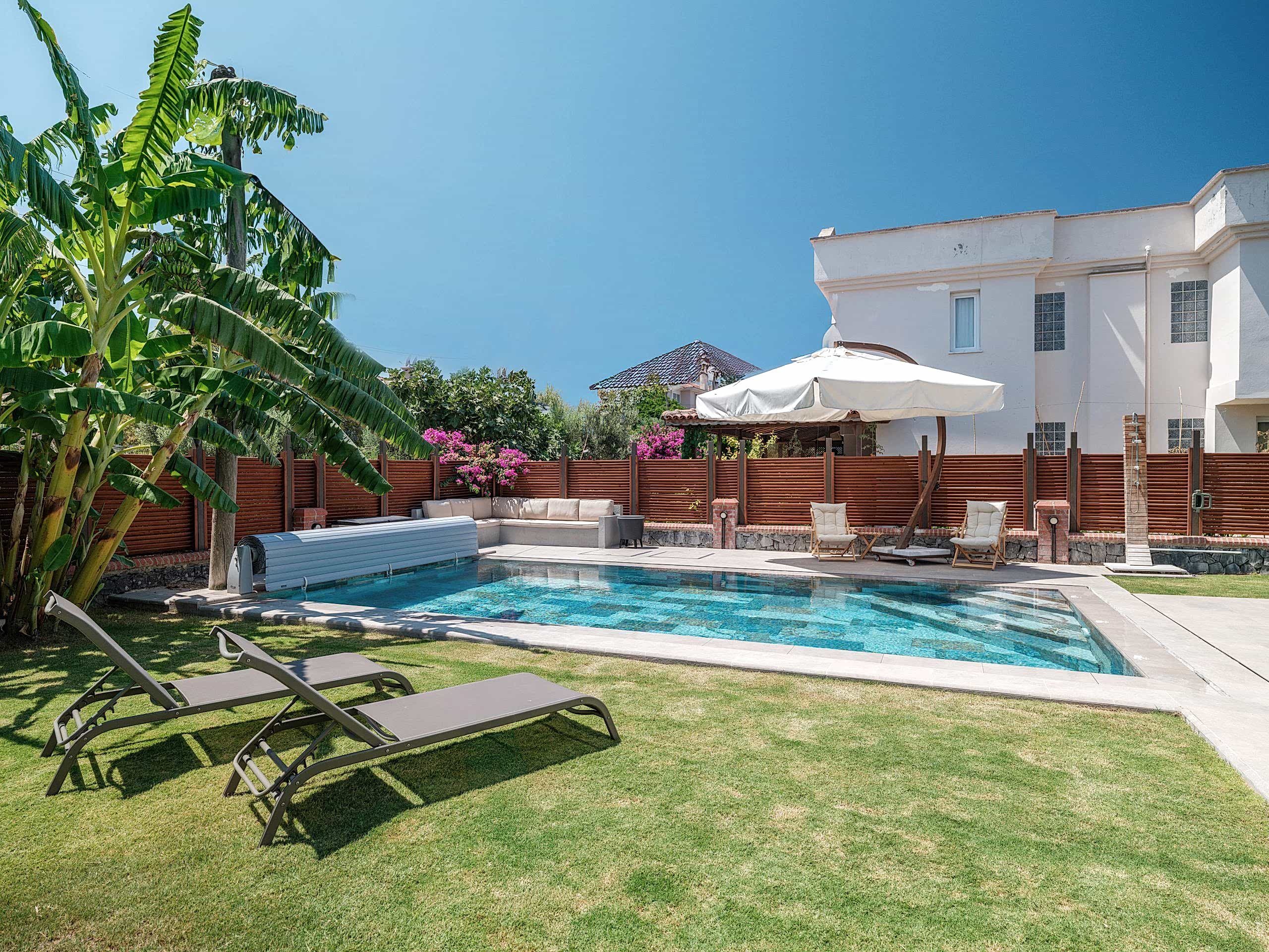 Çeşme Dalyan projemizde müşterimizin isteği üzerine özel olarak tasarladığımız havuz ile bahçelerini en verimli şekilde değerlendirdik.