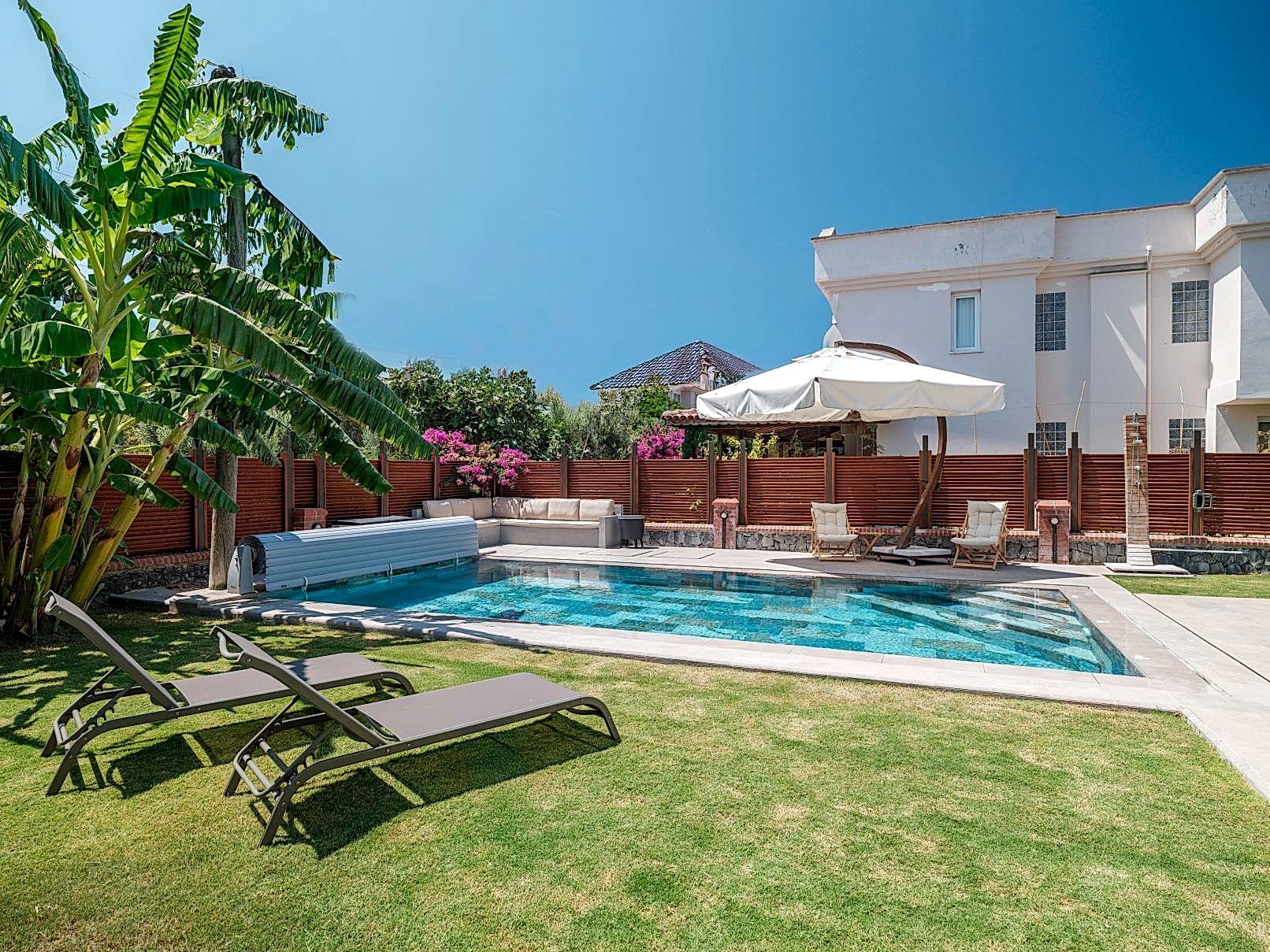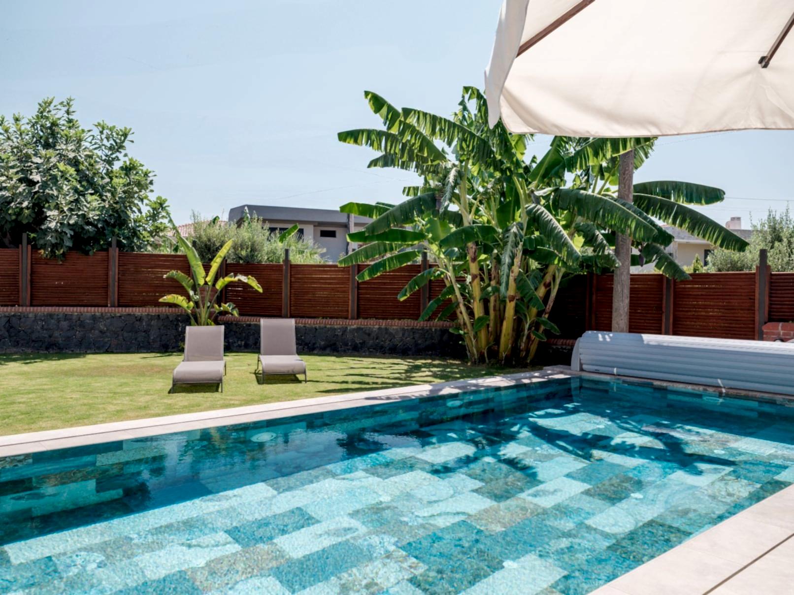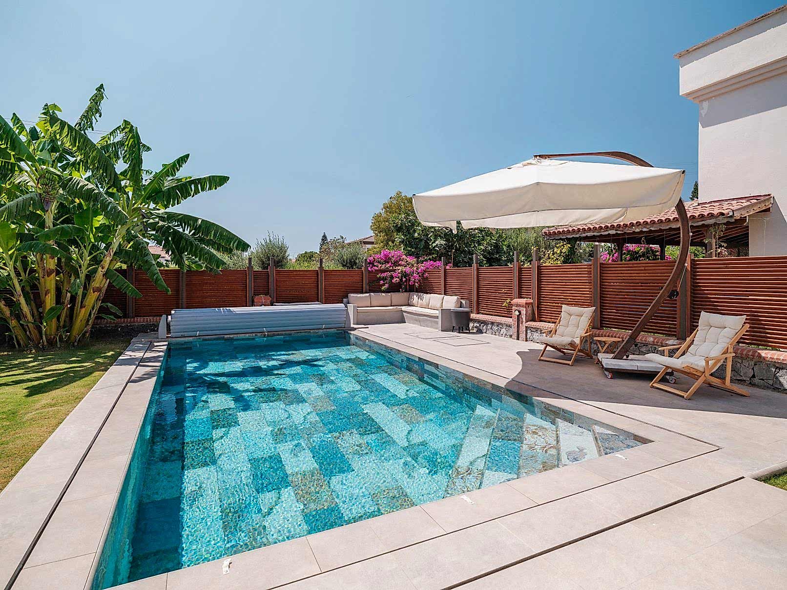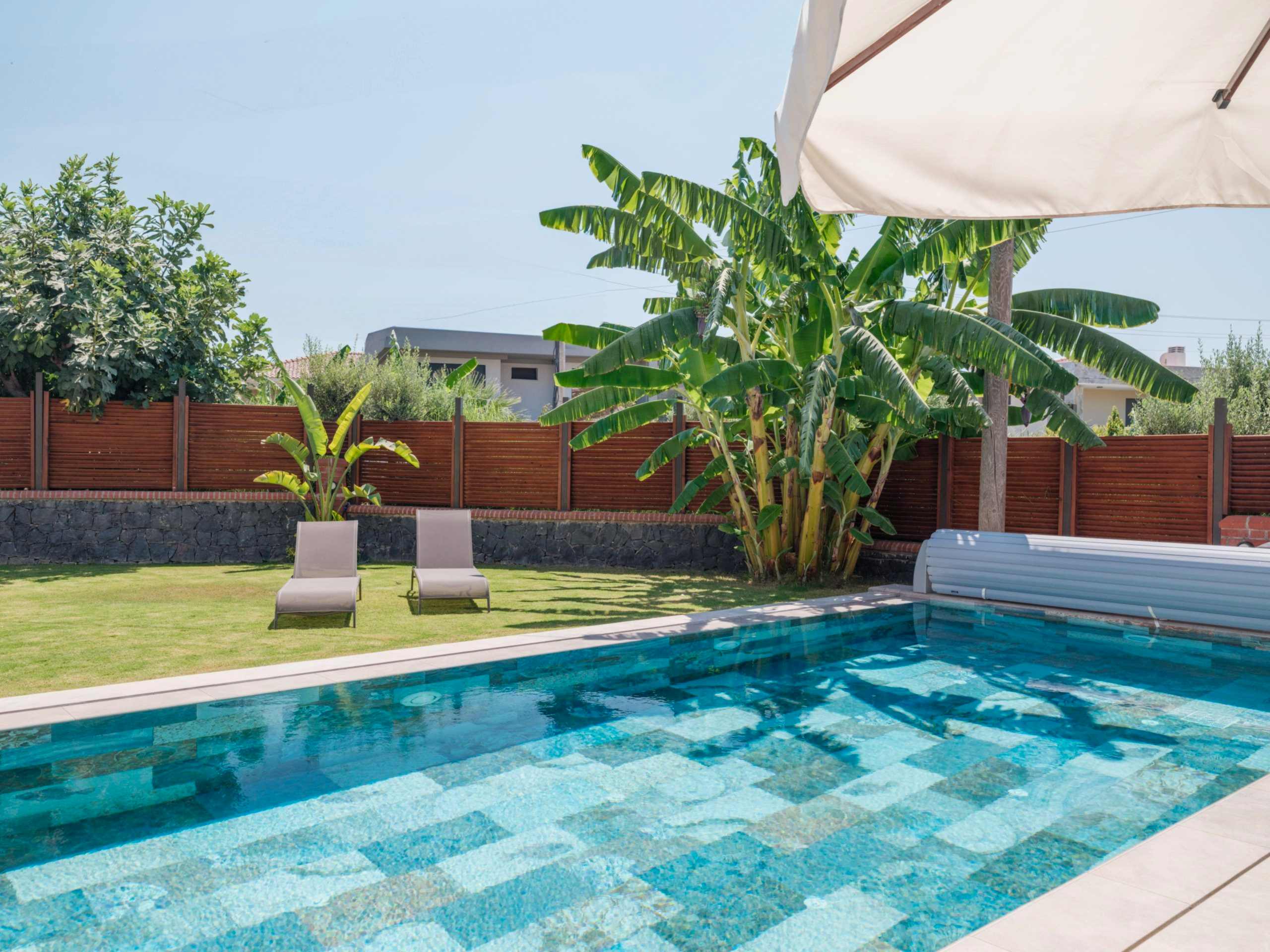 Çeşme Dalyan projemizde müşterimizin isteği üzerine özel olarak tasarladığımız havuz ile bahçelerini en verimli şekilde değerlendirdik.