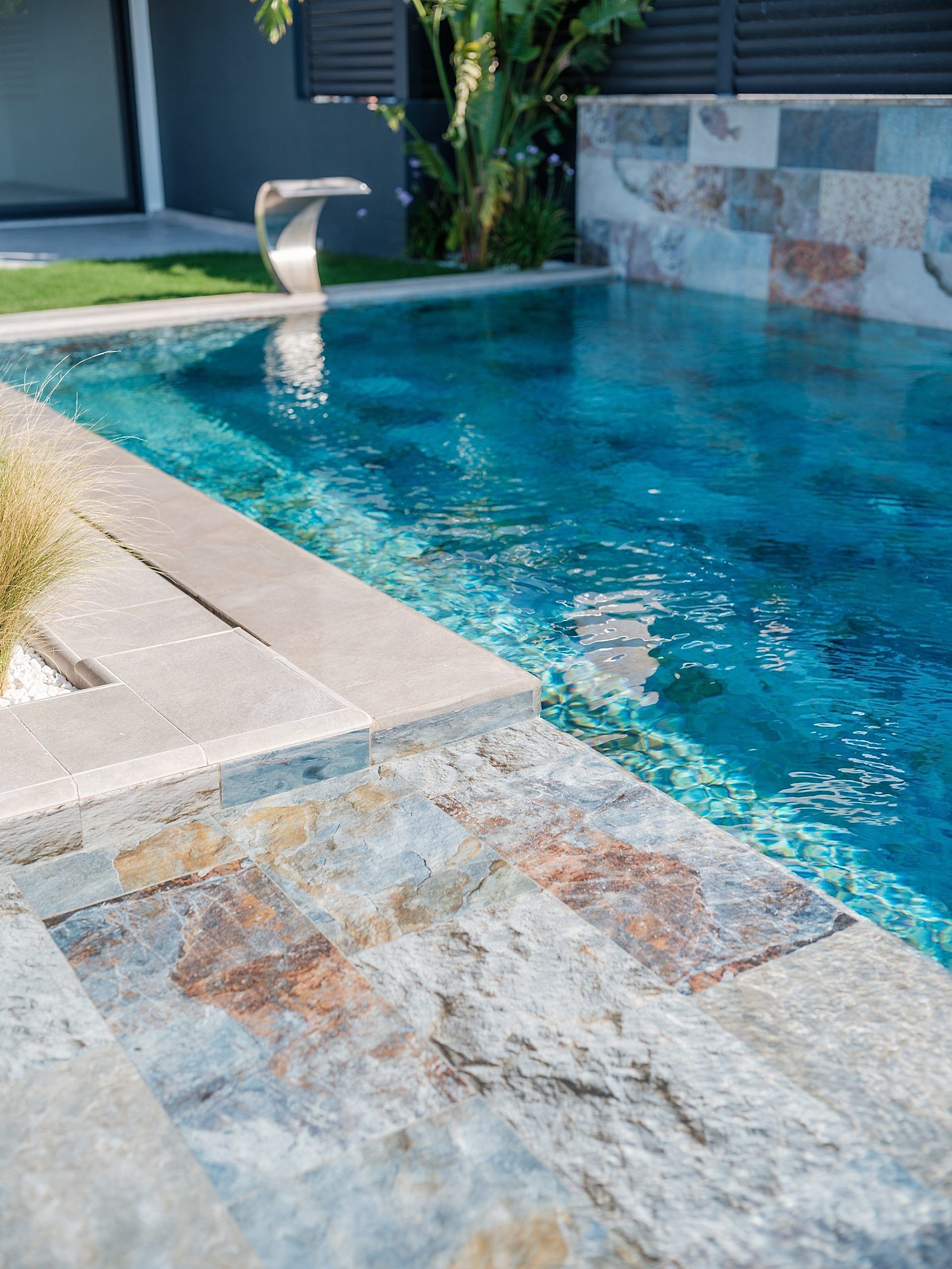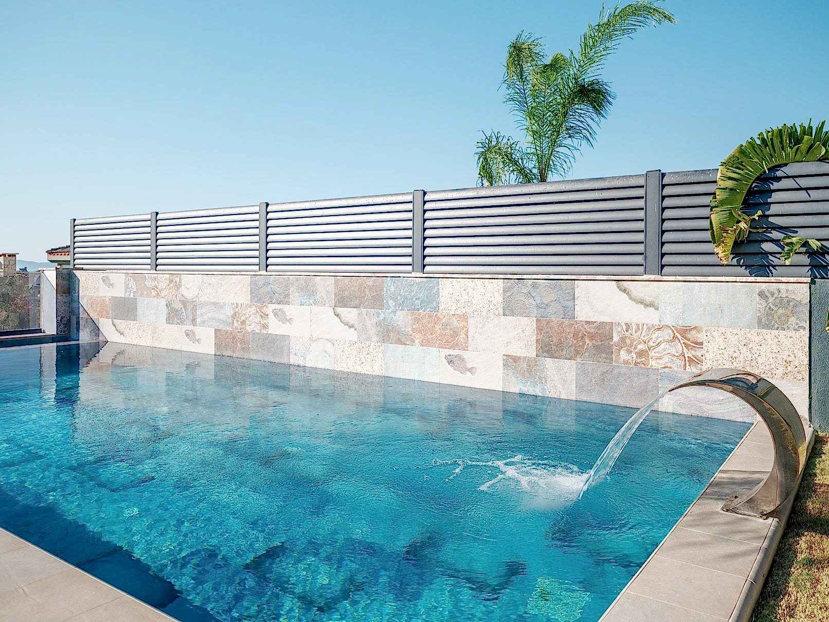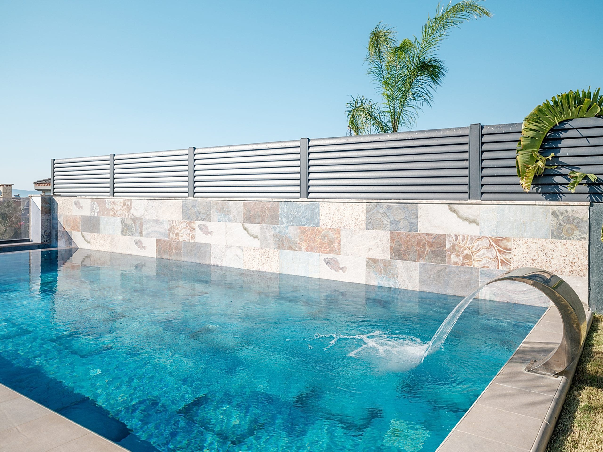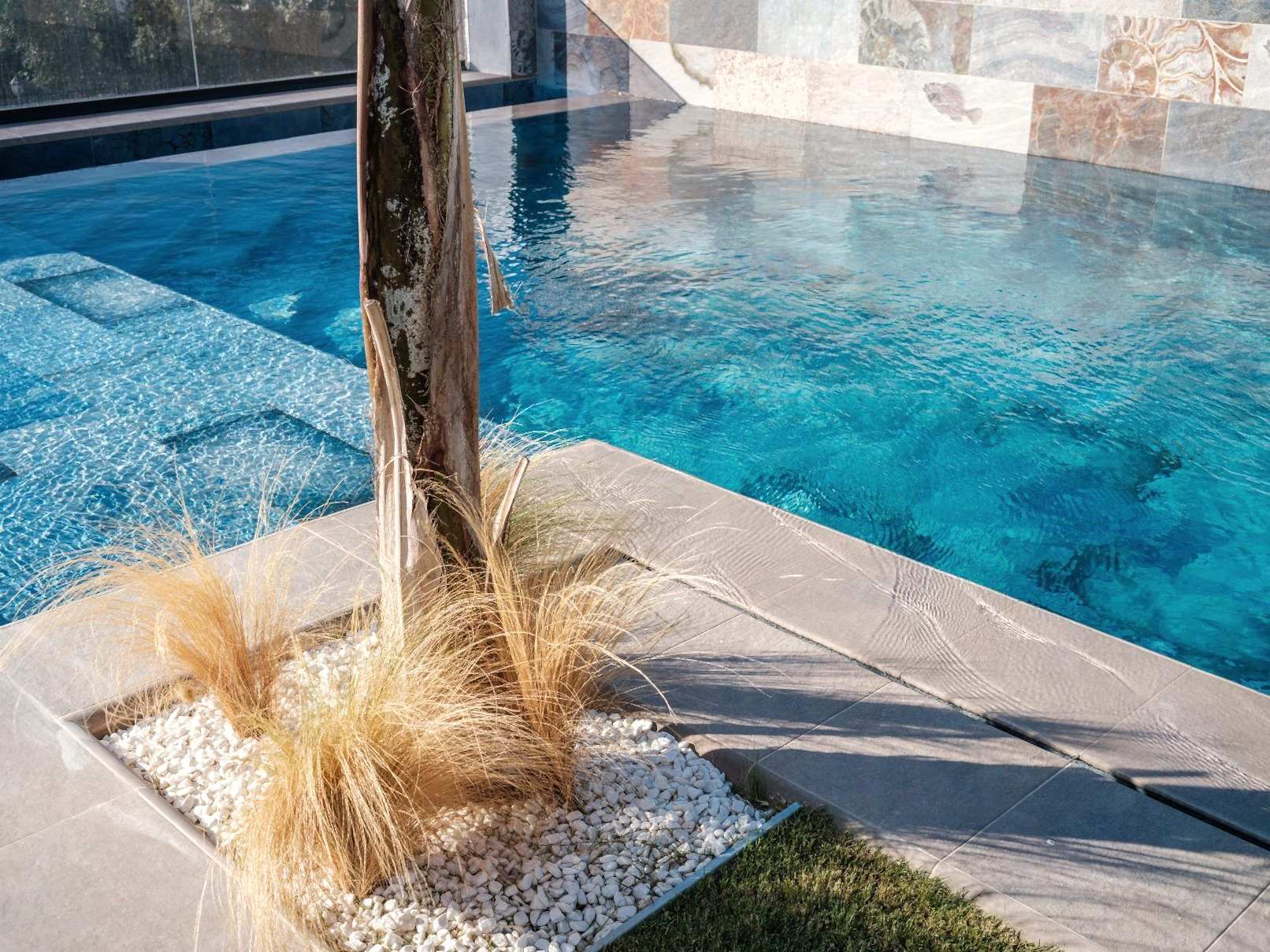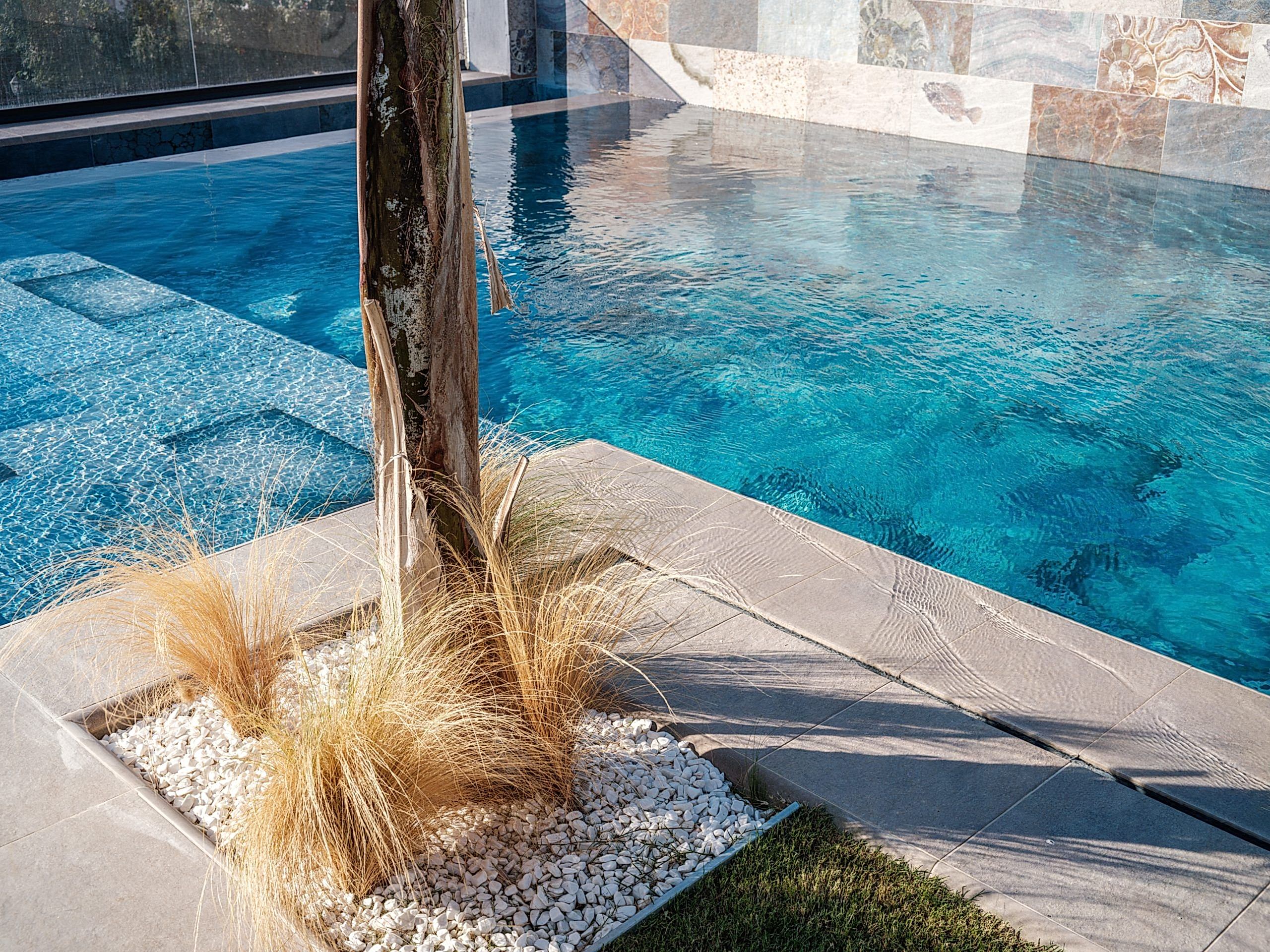 🖼️ İki havuzun ortak duvarında, havuzların bütünlüğünü sağlamak için aynı üründen farklı model kullanarak estetik bir uyum sağlandı.