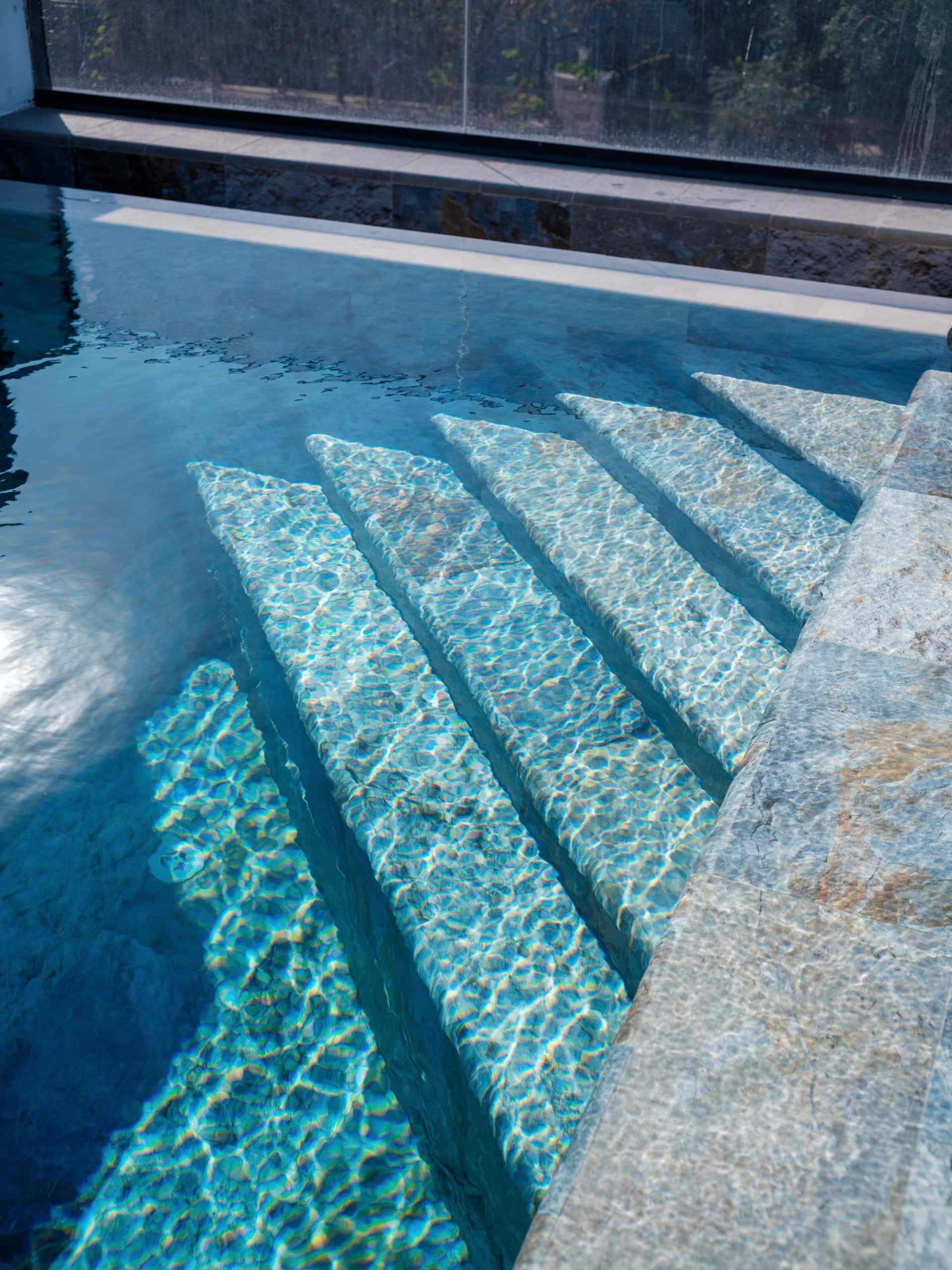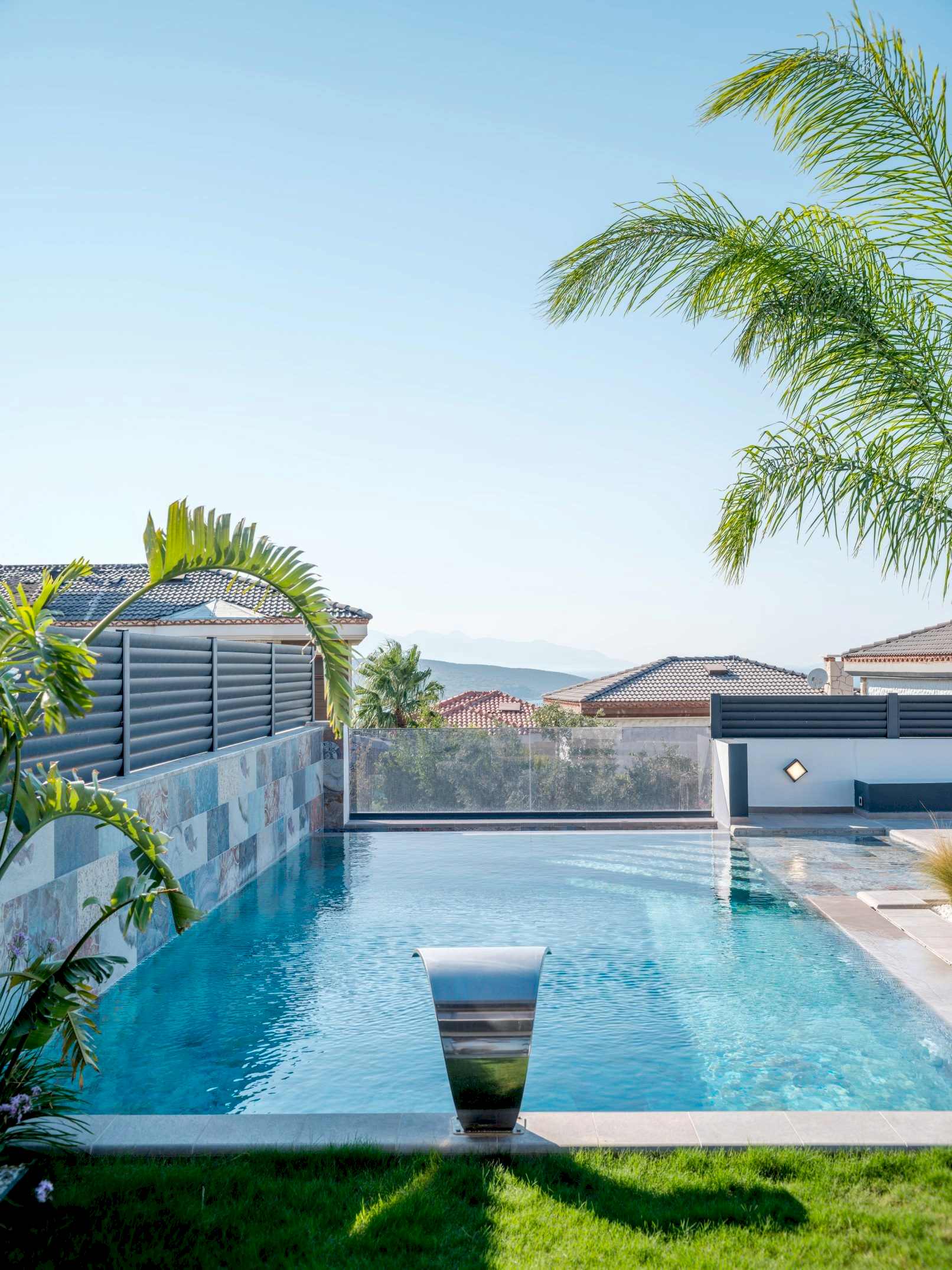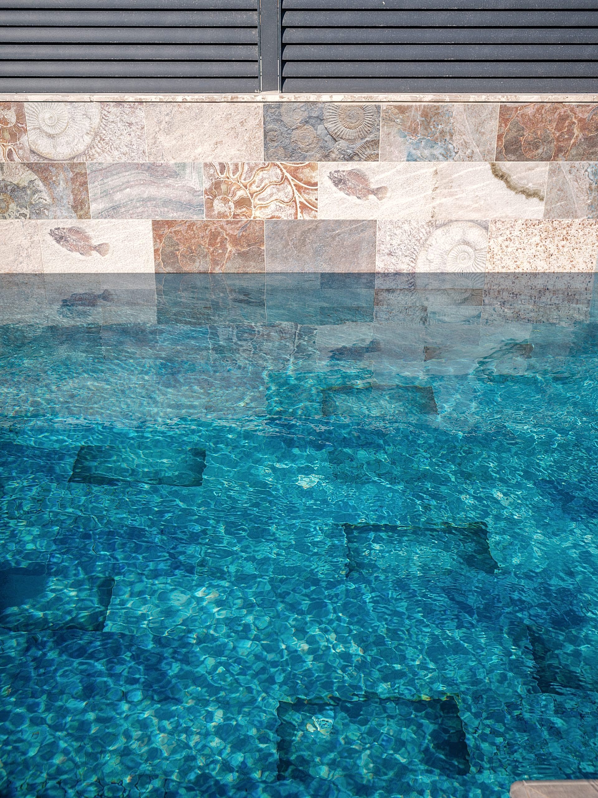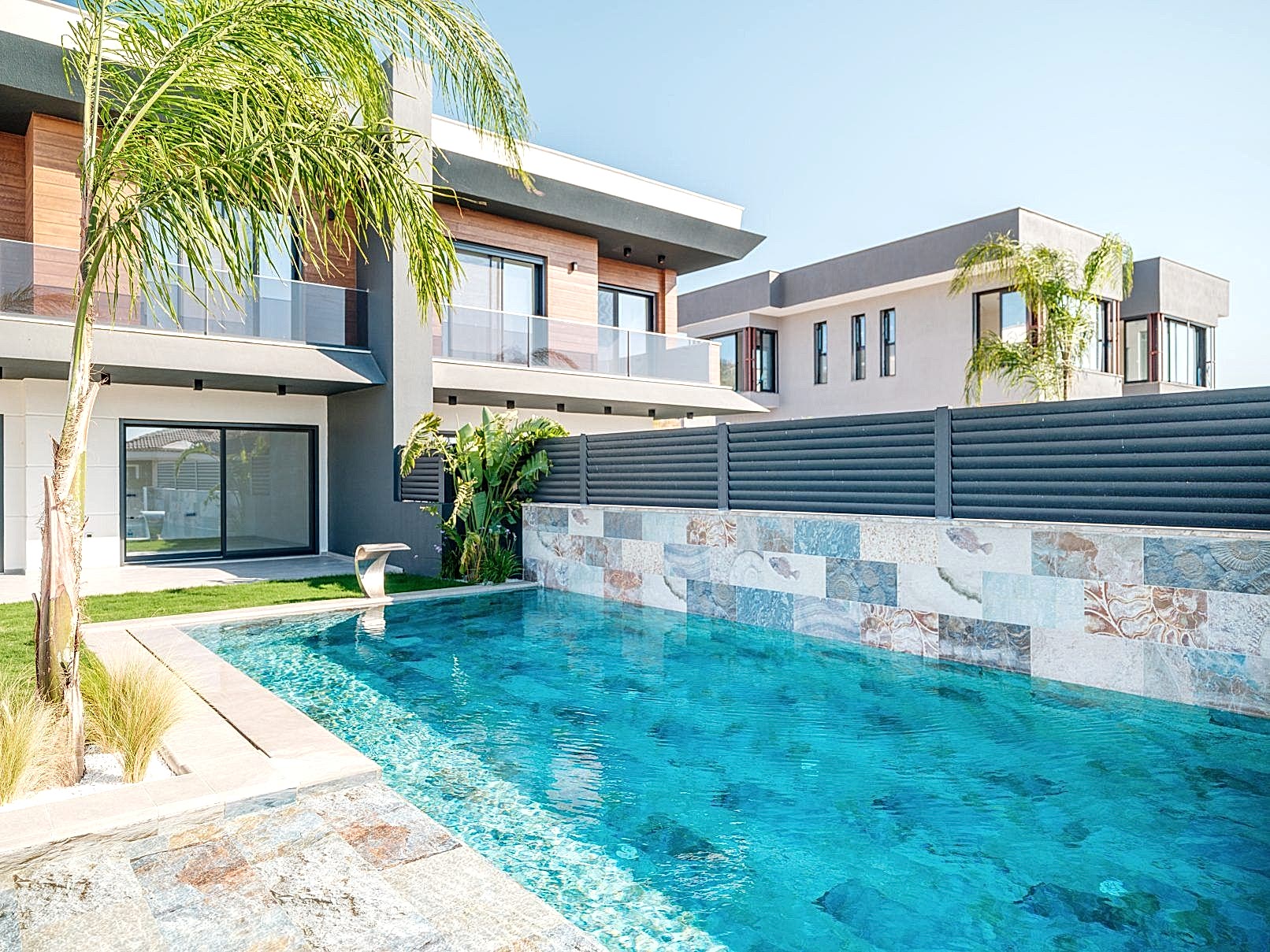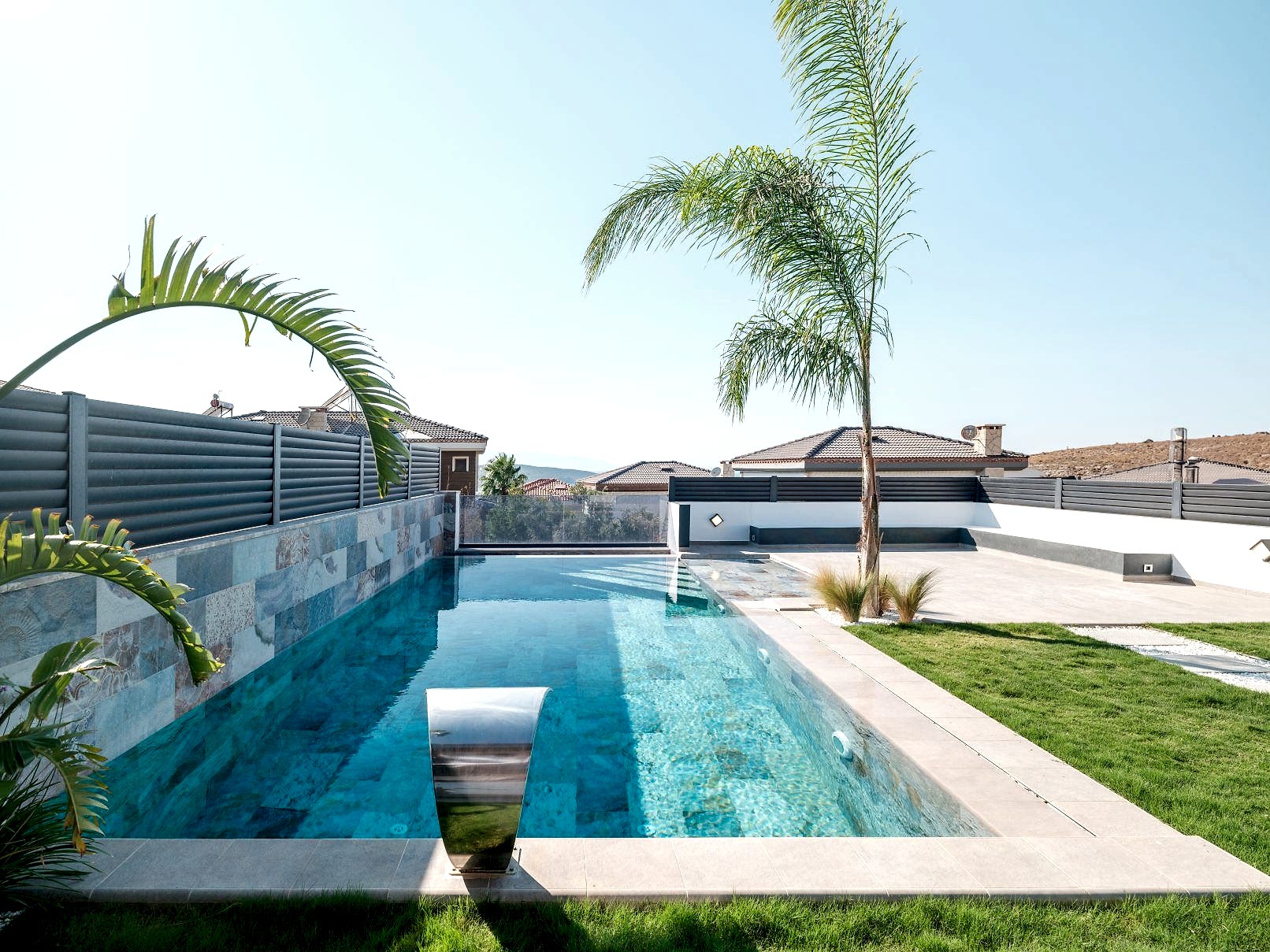🖼️ İki havuzun ortak duvarında, havuzların bütünlüğünü sağlamak için aynı üründen farklı model kullanarak estetik bir uyum sağlandı.